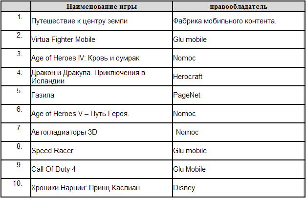 Игры<P><A href="http://www.cforum.ru/sub/content/arc/games_CForum.pdf">"Мобильные игры": маркетинговые материалы</A>, pdf<br> Интересная цифра: закачки игр Symbian составляют ~10%, ~90% приходится на долю J2ME.</p>"ИММО" (Украина) сообщает рейтинг Топ-10 самых продаваемых мобильных игрИгры · СНГ · Развлечения 05.02.2009, Компания ИММО публикует рейтинг ТОП-10 продаж Java-игр для мобильных телефонов и смартфонов за декабрь и январь 2008-2009 гг. на территории Украины. Исходными данными для анализа послужила статистика продаваемых ИММО игр для мобильных телефонов и смартфонов с 1 декабря 2008 года по конец января 2009 года. За отчетный период наиболее популярной игрой на территории Украины стал экшн по мотивам одноименного киноблокбастера «Путешествие к центру земли», снятого на основе знаменитого произведения Жюля Верна. Игра предоставляет возможность сыграть за полюбившихся по фильму и книге персонажей: Тревора Андерсона, его племянника или гида Хану. По дороге к центру земли геймеры встретят на дисплеях своих телефонов доисторических животных и даже увидят извержение вулкана! Второе место в рейтинге ТОП-10 продаж на Украине занял адаптированный для мобильных телефонов легендарный консольный файтинг Virtua Fighter Mobile. Украинские абоненты по достоинству оценили возможность насладиться изумительной графикой и принять участие в соревновании лучших бойцов мира. Третью позицию в рейтинге самых продаваемых мобильных игр в Украине за последние два месяца заняла стратегия «Age of Heroes IV: Кровь и сумрак», предлагающая игрокам сразиться за судьбу мира на стороне орков, демонов, людей или нежити. Полный рейтинг ТОП-10 популярных Java-игр для мобильных телефонов и смартфонов за декабрь-январь 2008-09 гг. на территории Украины выглядит следующим образом: © , пресс-релиз компании Публикации по теме: 25.12. [Бизнес] iFree обещает Войну грибов 2 / CForum.ru 18.12. [Бизнес] Road Smash: в отрыв! / CForum.ru 14.02. [Бизнес] i-Free приняла участие в Winter Nights: Mobile Games Conference / CForum.ru 27.11. [Бизнес] 16.11. [Бизнес] Услуга AdsCloud - рекламное облако для разработчиков и издателей мобильных приложений / CForum.ru ОбсуждениеВ форуме нет сообщений.