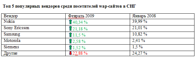 Группа компаний "Ириком" предлагает вашему вниманию ежемесячную WAP-статистику в виде отчета о динамике изменений за месяц по странам, ведущим операторам, популярным вендорам телефонов и разрешению экранов. Все данные предоставлены ресурсом SpyWap и представлены в процентном соотношении.
