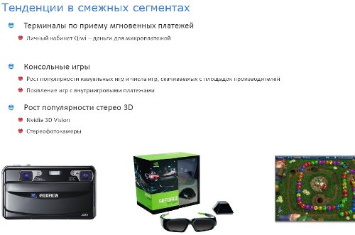 Mobile Marketing and Business Solutions Мобильный маркетинг и бизнес решения - этот рынок развивается. Естественно, в этом году у него был некоторый спад, потому что, как правило, очень многие компании, крупные FMCG бренды подрезали свои бюджеты, работать с ними стало сложнее. Тем не менее, там появилось много-много новых направлений, много компаний, которые, в частности, занимаются SMS-программами лояльности, SMS-CRM, SMS-рассылками. Компании стали диверсифицироваться, постепенно стала опять развиваться и расти (сильнее в этом году, чем в прошлом) мобильная реклама, хотя пока что значимых объемов в этом сегменте не достигнуто. m-Commerce and m-Payments Мобильные платежи и мобильная коммерция. Этот рынок, пожалуй, показал наибольший рост и во многом за счет него вырос весь рынок сервисов в целом. Если в 2007 году в общей структуре рынка было всего 12% , в 2008 - 22%, то в этом году - 30%. Этот рынок достиг практически US$300 млн, даже несмотря на изменения курсовых разниц, очень бурно растет. При этом практически все компании растут. Если в прошлом году на этом рынке было фактически три компании, то в этом году их уже семь. И если мы посмотрим на рейтинги операторов, в частности CPA-рейтинг "ВымпелКома" (партнерской программы для контент-провайдеров), то первые семь строчек там занимают компании, которые, так или иначе, занимаются микроплатежами. Микроплатежи - это использование телефона (в первую очередь SMS) для оплаты различных сервисов, на текущий момент - сервисов в интернете: различных сайтов, доступов к сайтам, услуг, игр и так далее. Таким образом, на сегодняшний день это почти треть рынка всего рынка мобильного контента, мобильного сервиса. Одним из главных драйверов роста, о которых я буду рассказывать здесь дальше, является создание более адекватных моделей мобильной коммерции, которые позволят принести все эти сервисы, в том числе в оффлайн сегмент. Rich-Media Content Сюда мы относим ту музыку и видео, которые мы скачиваем не для украшения своего телефона, а для того, чтобы ее послушать или посмотреть. Сегмент тоже растет, появляется все больше разных интересных проектов, связанных с мобильным телевидением, музыкальных порталов. В этом году деление трафика обеспечило определенные дополнительные предложения со стороны контент-провайдеров в этом сегменте. Ну и опять же распространение 3G сетей тоже сделало свое дело: на текущий момент в тех городах, где она есть, интернет стал уже дешевле, о чем я буду еще говорить, и люди достаточно активно используют свой телефон для загрузки более тяжелого контента. Так выглядит наша оценка динамики рынка в целом. Как вы помните, график немножко изменился по сравнению с прошлым годом, скорректировались прогнозы. Ожидали более бурного роста сегмента кастомизации, еще даже более активного роста сегмента платежей, хотя здесь наши ожидания оправдались. Как видно в большинстве остальных сегментов произошел небольшой спад. Но небольшой в целом спад. Контент-провайдеры: специализация Последовательность здесь не играет никакой роли. В частности, мы управляем порталом Tele2, есть компании, которые управляют отдельными разделами или целиком порталами операторов; порталы вендоров и ритейлеров; call-tv проекты; интерактив на телевидении; мобильный маркетинг и реклама, здесь компаний еще больше; партнерские программы в мобильном интернете; контент B2C (на сегодняшний д