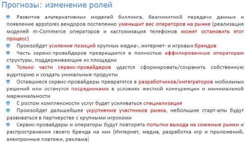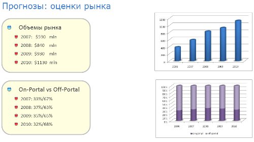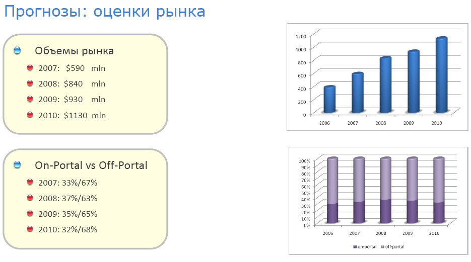 Целый ряд таких вот областей роста, которые, как обычно каждый год на нашем рынке можно видеть. Мы ожидаем, что эти точки роста в ближайший год-два, может быть, год-три, будут набирать обороты. Наш контентный рынок в следующем году. Мы считаем, что если взять перспективу... здесь $590 в 2007 году, $840 млн в 2008 году, мы ожидаем прироста рынка даже в долларовом исчислении в этом году - до $930 млн, и более миллиарда в 2010 году. Опять же тенденция On-Portal против Off-Portal Если по итогам 2007 года была пропорция 30/70% в пользу оффпортал, т.е. неоператорские проекты занимали 70% рынка, постепенно до 2008 года происходили изменения в пользу операторских проектов, их доля по итогам 2008 года выросла уже до 38%. Мы ожидаем, что в 2009 году ситуация ухудшится для операторов, вновь будет набирать силу off-portal, и в дальнейшем это продолжится. Например, та же услуга RBT, на текущий момент уже близка к потолку, а микроплатежи продолжают активно расти. В том числе, мобильный безлимитный интернет также приводит к тому, что услуги других сайтов, а не только порталов операторов, набирают все большую популярность. Эта тенденция, скорее всего, будет продолжаться. Т.е. мы ожидаем в дальнейшем уменьшения on-portal продаж мобильных сервисов и контента. Не буду здесь подробно останавливаться из-за недостатка времени. Только одно хочется отметить - мы считаем, что, возможно, будет уменьшаться вес операторов на рынке, потому что будут появляться безлимитные тарифы, application stores и альтернативные модели биллинга, в частности, через терминалы мгновенной оплаты. Тем не менее, эти процессы операторы в силах остановить, потому что они могут создавать кастомизированные телефоны и вовремя реализовать адекватную модель мобильной коммерции с низкой комиссией. Произойдет усилений позиций крупных медиа-, интернет- и игровых брендов. Мы видим это на примере App Stores, если ранее там многие разработчики могли получить сильные позиции, то сегодня там практически доминируют крупные бренды, такие, как Gameloft, EA и другие. Не всем сервис-провайдерам удастстя сформировать/сохранить собственные аудитории, создать уникальные продукты. Часть из них станет полностью аффилированными операторскими структурами, обеспечивающими поддержку их площадок. Часть из них станет разработчиками/интеграторами, как я уже говорил. Будет усиливаться специализация. Скорее всего, будет дальнейшее укрупнение рынка, и по-прежнему будут происходить попытки выхода на смежные рынки, в частности, в интернет, разработку игр, приложений, в сектор электронных платежей, рекламу. >> Ключевые фрагменты выступления Кирилла Петрова - часть 9 Что можно сделать для развития рынка? Очень коротко... Что касается операторов: развитие инфраструктуры для оказания новых услуг, поддержка инновационных проектов. Сервис-провайдеры: искать новые направления и в них инвестировать, искать и поддерживать успешные стартапы, стараться находить внешние точки роста, вырабатывать стандарты, консолидировать позиции операторов для реализации совместных стандартов. Это очень важно и очень сложно. Правообладатели. Должны быть готовы к реализации гибких ценовых механизмов в области продаж цифрового контента. Активно экспериментировать в части инновационности для реализации потенциала цифровых продаж. Их задача - противодействие пиратству. Интернет-компании. Можно рекомендов