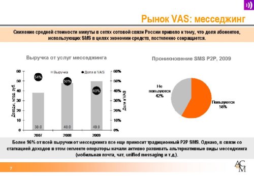 Встречи<STRONG><!--A href="http://www.cforum.ru/content/meetings2006.htm">Календарь встреч 2007 года</A> : <A href="http://www.cforum.ru/content/meetings2006.htm">Предстоящие</A> <A href="http://www.cforum.ru/content/meetings2006_arc.htm">Прошедшие</A--></STRONG> <A href="http://www.cforum.ru/news/article/090914.htm">Материалы форума "Цифровой маркетинг" Россия 2009</A></p>Оксана Панкратова, аналитик AC&M. Часть 4/6 - Рынок VAS России. Месседжинг21.06.2010, Представляем фрагмент конспекта выступления Оксана Панкратовой, аналитика AC&M, "Рынок VAS и контент-услуг в России" и слайды ее презентации 15 июня 2010 на встрече "Мир Мобильного контента". Вкратце пройдусь по основным группам услуг: месседжинг, мобильный интернет и контент. Как мы видим, доля месседжинга в общих доходах от VAS сокращается. Доля абонентов, использующих SMS с целью экономии средств - это основная группа абонентов, которые вообще пользовались p2p тоже сокращается, в связи с тем, что снижается средняя стоимость минуты в сетях сотовой связи России. Среднемесячная аудитория SMS P2P в 2009 году составила порядка 58%, что, в принципе, показывает драматическое снижение. Насколько я помню, года 2-3 назад эта доля составляла порядка 70%. << К части 3 выступления --- К части 5 выступления >> © Публикации по теме: 24.04. [Встречи] 31.07. [Встречи] 26.06. [Мобильные платежи · Встречи · Мобильная коммерция] 26.06. [Встречи] 26.06. [Встречи] ОбсуждениеВ форуме нет сообщений.