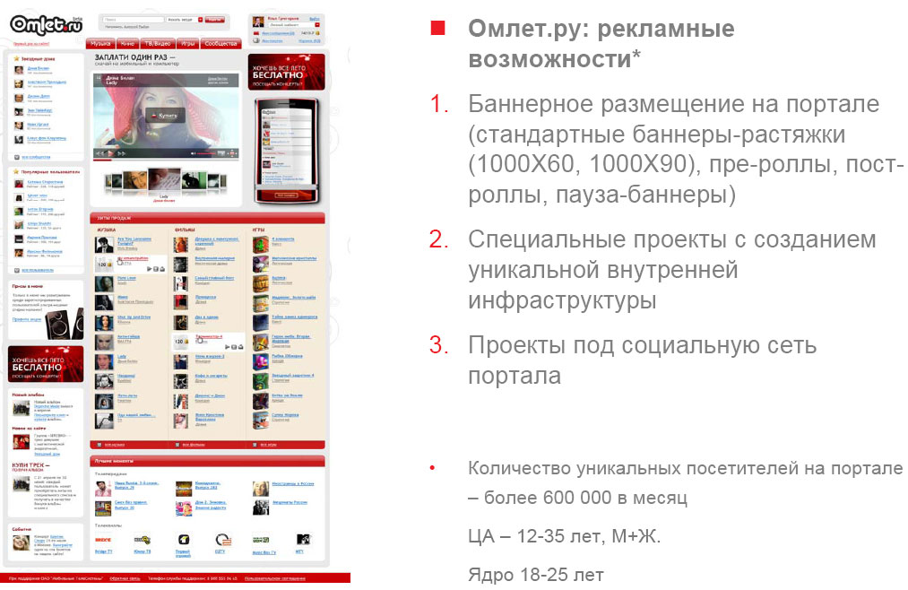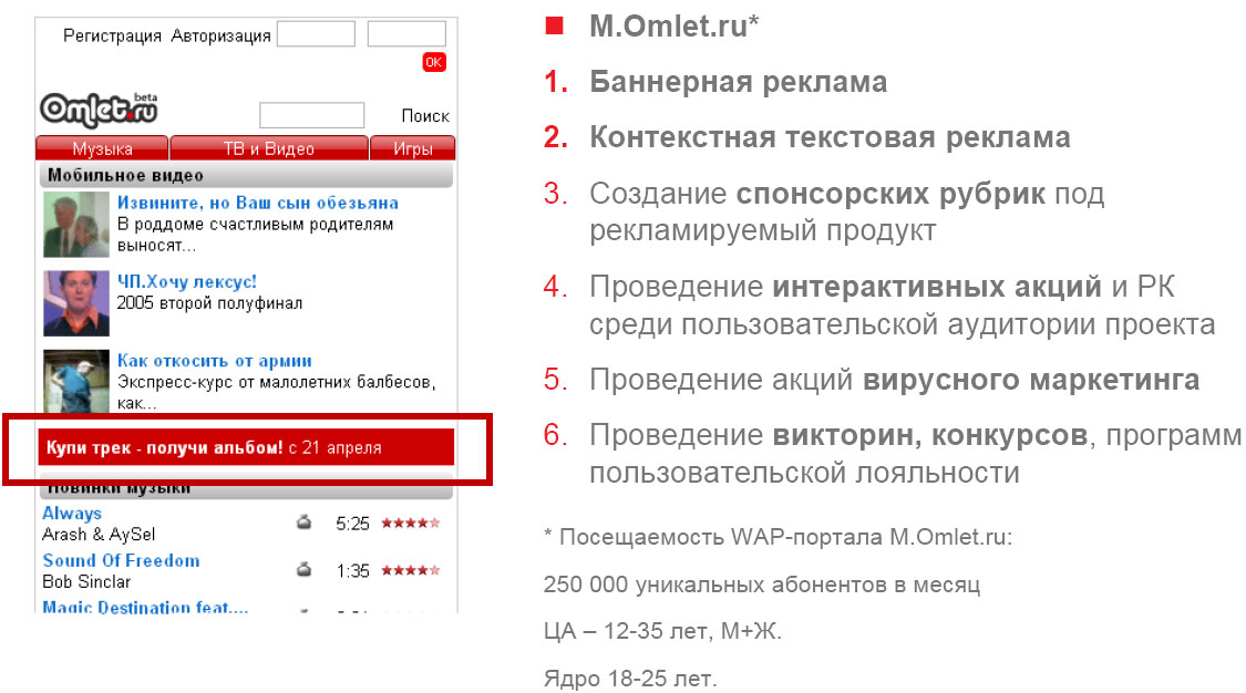 15 октября в Москве прошел форум "Цифровой маркетинг". Выступивший на форуме с презентацией "Мобильная реклама с МТС" Павел Ройтберг, директор департамента по развитию продуктов и услуг МТС, рассказал, в частности, о возможностях портала Omlet.ru, как рекламной площадки. Основные мобильные рекламные площадки - Omlet.ru 15 октября в Москве прошел форум "Цифровой маркетинг". Выступивший на форуме с презентацией "Мобильная реклама с МТС" Павел Ройтберг, директор департамента по развитию продуктов и услуг МТС, рассказал, в частности, о возможностях портала Omlet.ru, как рекламной площадки. Мобильный Omlet.ru - это мультимедийный портал, следующее поколения выхода оператора в интернет, предыдущим следует считать WAP c его несколькими миллионами лояльных пользователей, но при этом база пользователей WAP не растет, ее потенциал ограничен, а в ближайшие годы число пользователей WAP будет сокращаться. Мобильный Omlet.ru, напротив, показывает высокий потенциал роста. На сегодняшний день - это порядка 250 тысяч уникальных посетителей в месяц. Реклама на портале присутствует с момента создания. Изначально - это реклама собственных сервисов МТС на портале, но МТС готова часть размещений продавать. Есть еще интернет-версия Omlet.ru Слева внизу и справа вверху можно видеть два прямоугольных баннера (красные). Сейчас это обычно реклама контентных сервисов МТС, но компания готова продавать эти баннеры. Плюс возможности интеграции в портал (спонсорский контент, баннеры, конкурсы, предложения таргетированные на социальную и UGC- части портала). Поскольку история новая, МТС пока не очень много дает статистики по данному проекту, но по мере развития портала, статистика будет доступна для партнеров. Сейчас компания говорит о 600 тысячах уникальных посетителей в месяц, растет база зарегистрированных пользователей, их уже существенно больше 100 тысяч. Источники Мобильная реклама с МТС