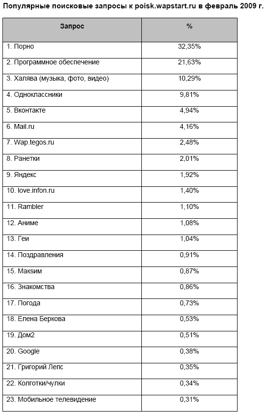 Метки: WAP, популярные поисковые запросы в WAP, WAPStart, мобильный интернет, февраль 2009, рейтинг поисковых запросов в WAP