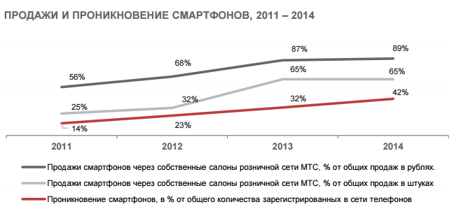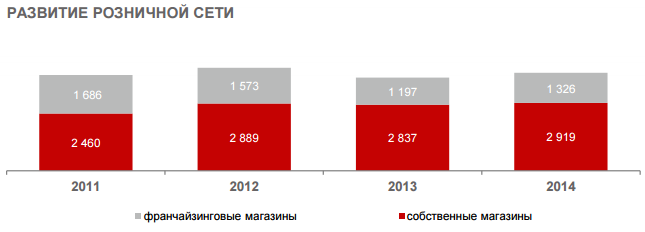 , редактор MForum.ru МТС: На конец четвертого квартала 2014 года розничная сеть МТС насчитывала 4 245 салонов, включая 1 326 франчайзинговых точек продаж