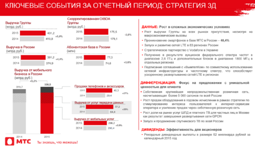 Компания Sprint, США, показала работу смартфона Samsung Galaxy S7 в сети LTE-A 3CA. В условиях реальной сети могут быть достигнуты пиковые скорости выше 200 Мбит/с. Сегодня Sprint уже предоставляет услуги LTE-A 2CA b41+b41 более, чем в 150 регионах США в рамках услуги LTE Plus, агрегируя 40 МГц частот в диапазоне 2.5 ГГц. Компания планирует добавление третьей полосы частот для еще большего повышения доступных скоростей. Для этого будет задействована суммарная полоса в 60 МГц. У оператора есть значительные возможности для дальнейшего расширения сети, Sprint располагает ресурсом в 120-160 МГц в диапазоне 2.5 ГГц в более, чем 100 регионах США. Пока что компания тестирует 3CA в лаборатории в городе Reston, Вирджиния. В Sprint хотят испытать еще несколько устройств кроме SGS7 до того, как начнется внедрение поддержки третьей несущей. / , редактор MForum.ru 20.03.2016 13:30 От: Elmira92 ![]() Добрый день , помогите найти телефон , украли , 6s 16 gb greay imei 355427078510001 20.03.2016 15:53 От: avenz09 ![]() Здравствуйте украли iphone 5 32 gb imei 990002755448121 помогите найти,опеределить.. 21.03.2016 09:31 От: Nikkikola ![]() Главное сервисы у него есть в России. Для китайских телефонов это важно! 21.03.2016 11:40 От: diprus ![]() Тема: Билайн А106 * Добрый день! Помогите пжл разблокировать 355730052458299! Спасибо 21.03.2016 15:02 От: mopozzko ![]() Телефон IPhone 5s 16G IMEI 352016060035011 Помогите с информацией. Пожалуйста! NOKIA 6303 забыл код помогите imei 358281035339088 mail zolotarev_tosha@mail.ru Сегодня МТС провела раскрытие показателей 4q2015 и итогов 2015 года по группе компаний МТС. Результаты показаны ударные. Представляю вашему вниманию конспект презентации итогов г-ном Дубовсковым. , редактор MForum.ru Андрей Дубовсков (АД): Обратите внимание на то, что в 2015 году выручка группы компаний МТС выросла на +5%. Уже второй отчетный период подряд мы даем раскладку показателей, чтобы избежать спекуляций на тему, чем эта выручка объясняется. Вы видете, что выручка от продажи телефонов и аксессуаров выросла за год на 37%. Также стоит отметить, что выручка от услуг передачи данных выросла за год на +20%. Отмечу также рост на 2% выручки от мобильных услуг. Вы можете сравнить ее с показателями наших конкурентов (прим.АБ: -0.2; у МегаФон, +0.2% у Билайн). Скорректированная OIBDA группы показывает небольшое проседание, на -2.0% за год, но если посмотреть на Россию, то здесь OIBDA удалось удержать, она даже незначительно выросла (прим.АБ, на 0.1 млрд или 0.0%, тогда как у МегаФон -4.4%, у Билайн -2.6%). Выручка в России у нас приросла (+4.4%), выручка от мобильного бизнеса - еще заметнее. (+5.2%). , редактор MForum.ru АД: Сплит выручки показывает, что вырос вклад продаж телефонов и оборудования (+2%), Стабильно вела себя доля выручки в России, несколько снизился вклад Украины. 5-процентный рост всей выручки группы по итогам года - это просто замечательный результат. , редактор MForum.ru Форум закрыт для новых сообщений.