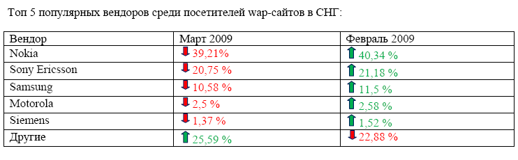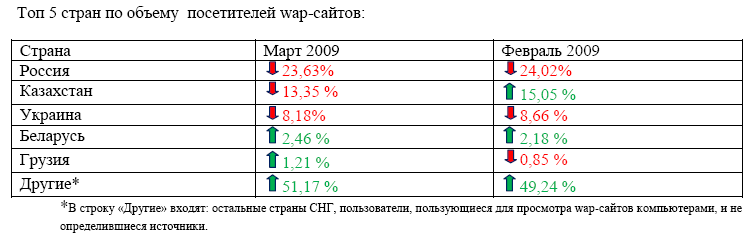 Группа компаний Ириком предлагает вашему вниманию ежемесячную WAP-статистику в виде отчета о динамике изменений за месяц по странам, ведущим операторам, популярным вендорам телефонов и разрешению экранов. Все данные предоставлены ресурсом SpyWap и представлены в процентном соотношении.